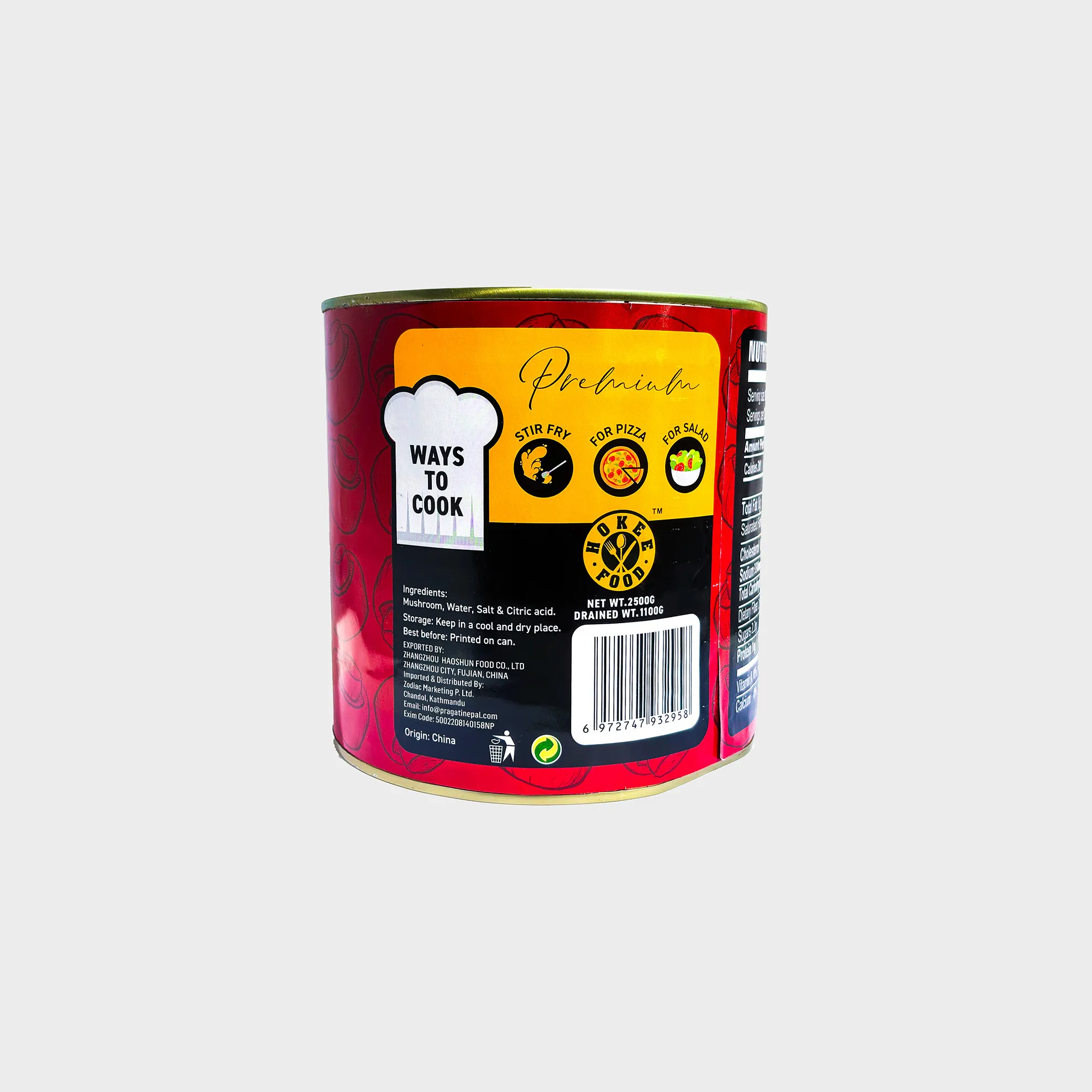 Hokee Food Canned Mushroom Whole offers high-quality mushrooms, carefully preserved to retain their natural flavor and texture. Fully drained and ready to use, these mushrooms are perfect for cooking, baking, or adding to salads, pizza, soups, and stir-fries. Convenient, versatile, and nutritious, Hokee mushrooms save time in the kitchen without compromising taste. Available for purchase at Shree Kathmandu Suppliers, Kathmandu, Nepal, making it easy to get fresh, ready-to-use mushrooms locally.